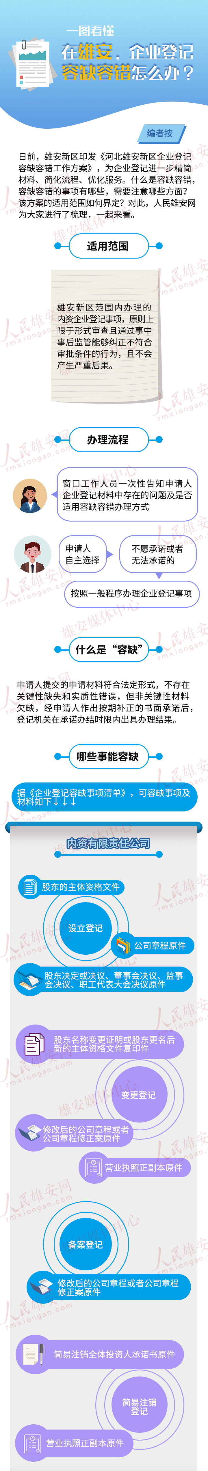 人民網(wǎng)雄安5月25日電 日前,雄安新區(qū)印發(fā)《河北雄安新區(qū)企業(yè)登記容缺容錯工作方案》,為企業(yè)登記進一步精簡材料、簡化流程、優(yōu)化服務(wù)。什么是容缺容錯,容缺容錯的事項有哪些,需要注意哪些方面?該方案的適用范圍如何界定?對此,人民雄安網(wǎng)為大家進行了梳理,一起來看。