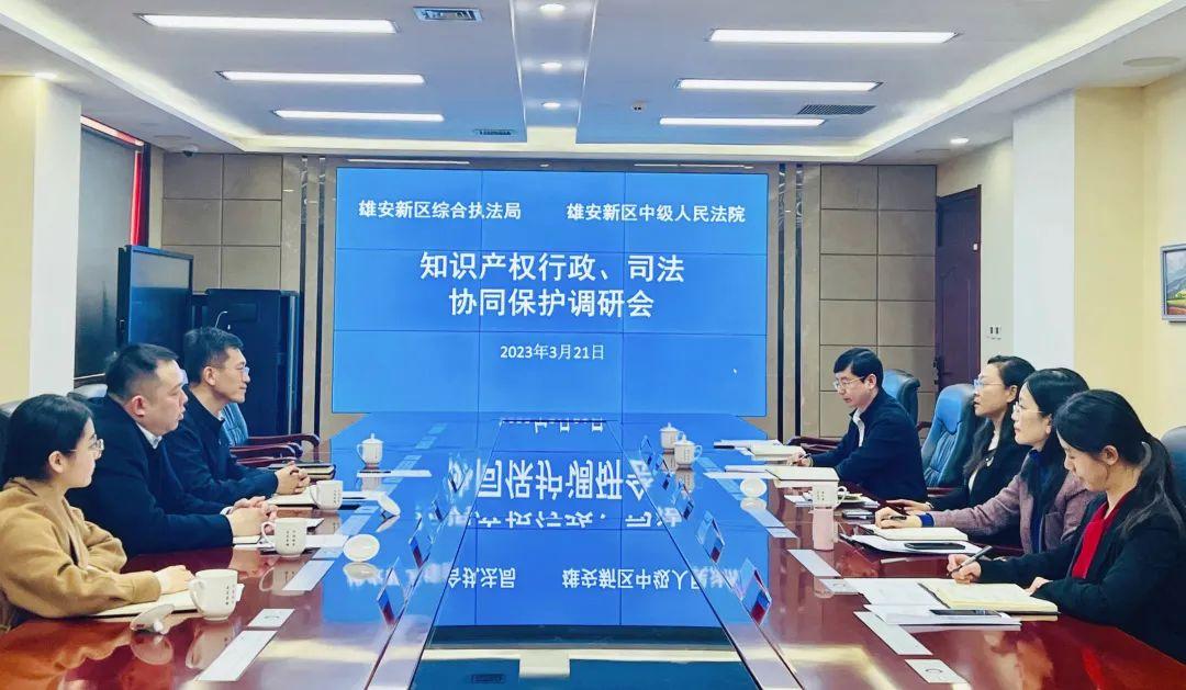 為落實河北省市場監(jiān)督管理局、河北省高級人民法院聯(lián)合印發(fā)的《關于落實強化知識產(chǎn)權協(xié)同保護意見的通知》要求,積極營造雄安新區(qū)穩(wěn)定公開透明、可預期的法治化營商環(huán)境,3月21日、22日,雄安新區(qū)中級人民法院與雄安新區(qū)綜合執(zhí)法局副局長李聰一行、中國(河北)知識產(chǎn)權保護中心張陽主任一行就知識產(chǎn)權司法行政協(xié)同保護開展了調研座談,旨在強化雄安新區(qū)知識產(chǎn)權司法機關與行政保護部門的協(xié)作配合機制,提升協(xié)同保護力度,為優(yōu)化雄安新區(qū)市場經(jīng)濟環(huán)境貢獻知識產(chǎn)權智慧。