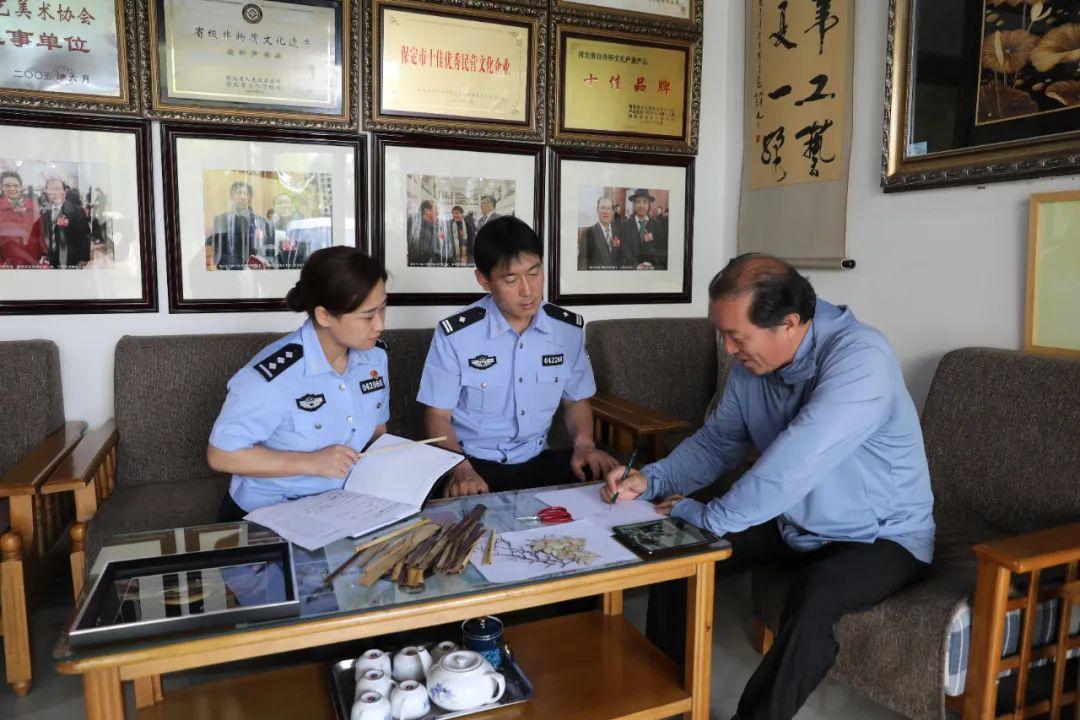 容城縣公安局交通管理大隊民警與蘆葦畫非遺傳承人楊丙軍老師深入交流交通安全文化創(chuàng)作思路和理念。