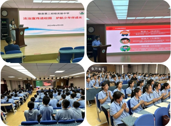 活動現(xiàn)場,雄縣第二初級實驗中學法治副校長蔡朝陽同志圍繞預防校園欺凌、河北冀雄律師事務(wù)所律師馮萱圍繞《中華人民共和國未成年人保護法》分別向?qū)W生做了專題講座。通過生動的案例展示和深入淺出的講解,引導學生樹立法治意識,自覺抵制不良誘惑,切實增強法治觀念和自我保護能力。同學們對于上述法律法規(guī)以及如何養(yǎng)成良好的行為習慣有了較為全面的了解,并掌握了基本的法律知識?,F(xiàn)場同學們專注認真地學習,積極參與互動,活動氣氛熱烈,收獲圓滿。
