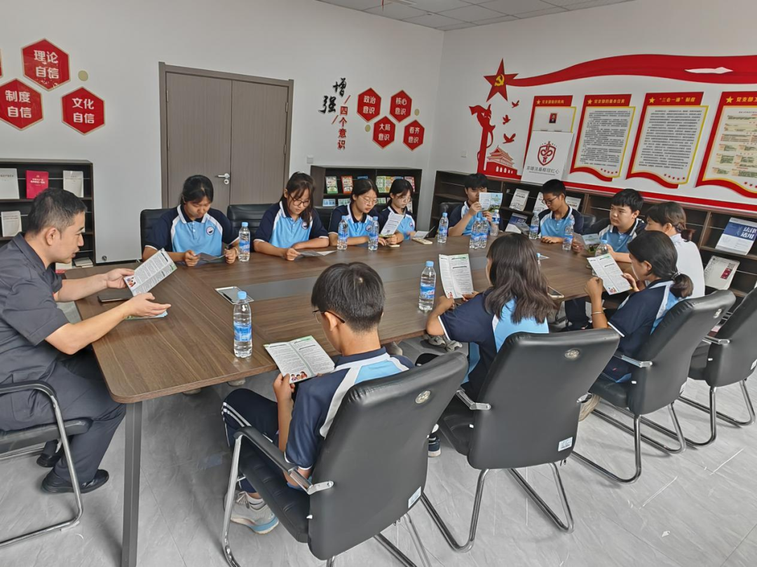 老師和學(xué)生們參觀了安檢室、信訪接待室、調(diào)解室、訴訟服務(wù)中心,負責(zé)人郭智輝介紹法庭黨建和審判融合工作開展情況,如何以“黨建紅”引領(lǐng)“法治藍”,以司法裁判為“盾”筑牢法律底線,老師和學(xué)生們對黨建和審判融合工作有了深入的了解。