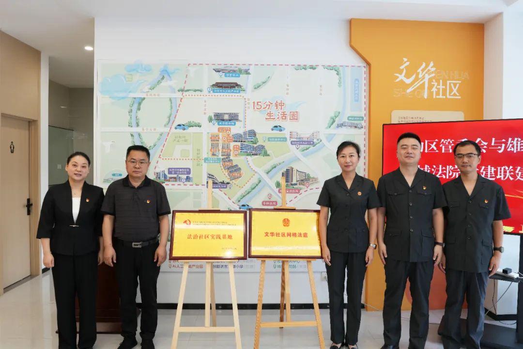 為促推基層治理法治化水平“上臺階”,8月19日,河北雄安新區(qū)中級人民法院、容城縣人民法院與雄安新區(qū)啟動區(qū)管理委員會在文華社區(qū)開展黨建聯(lián)建活動。雄安新區(qū)社會工作部副部長張春雷,雄安中院黨組副書記、副院長李靜靜共同為“法治社區(qū)實踐基地”和“文華社區(qū)網(wǎng)格法庭”揭牌。啟動區(qū)管委會黨組成員、副主任黃媛媛,容城法院黨組成員、副院長郭凱以及黨員干警、社區(qū)群眾代表30余人參加活動。
