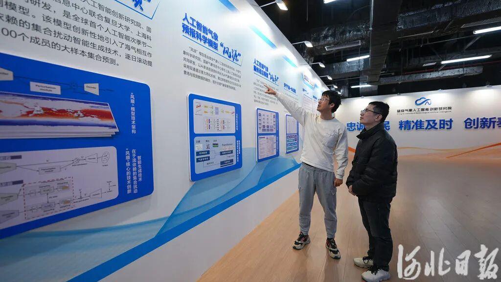 2月6日,在雄安氣象人工智能創(chuàng)新研究院展示大廳,竇則勝和工作人員正在探討人工智能氣象預(yù)報科學(xué)模型“風(fēng)源”。河北日報見習(xí)記者李暢攝