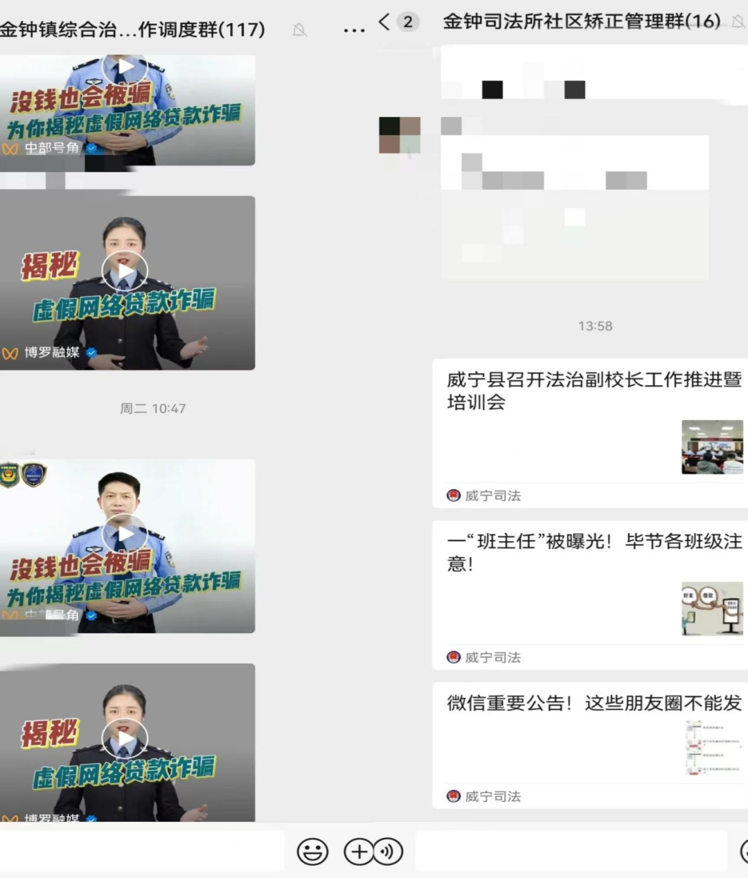 借助微信群的便捷性,金鐘司法所建立了多個(gè)微信工作群,定期推送法律條文解讀、典型案例分析等內(nèi)容,為群眾提供了一個(gè)便捷、高效的線上學(xué)習(xí)平臺(tái)。同時(shí),司法所工作人員針對(duì)微信群里群眾咨詢的法律問(wèn)題及時(shí)解答,形成了良好的互動(dòng)交流氛圍。2023年以來(lái),金鐘司法所通過(guò)微信工作群轉(zhuǎn)發(fā)普法案例及短視頻近1萬(wàn)條,覆蓋2萬(wàn)余名群眾。