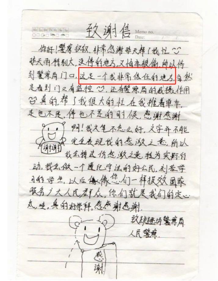 感謝信中,女孩用真摯而稚嫩的語言表達了對派出所民輔警的感激之情“這是一個我非常信任的地方?!敝赡鄣墓P跡讓全所民輔警動容,信中附著的手繪插畫,雖然簡單卻充滿了童真和感激。