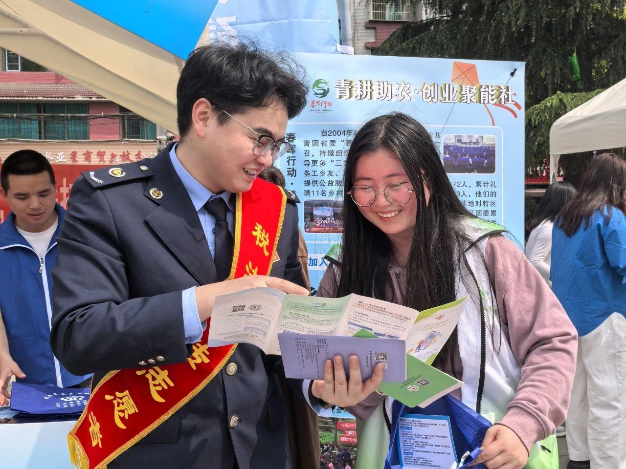 在活動(dòng)現(xiàn)場,稅法宣傳志愿者穿梭于“青聽心聲·鄰里會(huì)客廳”“青護(hù)家園·環(huán)保先鋒營”“青耕助農(nóng)·創(chuàng)業(yè)聚能社”等展示區(qū),用通俗易懂的語言為“擺攤者”“趕集者”講解個(gè)人所得稅專項(xiàng)附加扣除、重點(diǎn)群體創(chuàng)業(yè)就業(yè)稅收優(yōu)惠、社保費(fèi)繳納流程等與群眾生活、經(jīng)營息息相關(guān)的熱點(diǎn)稅收知識(shí)。此次活動(dòng)還設(shè)置了稅法咨詢臺(tái),為前來咨詢的商戶、青年提供“一對(duì)一”答疑服務(wù),并發(fā)放印有國家稅務(wù)總局微信公眾號(hào)二維碼的宣傳折頁,方便青年群體掃碼獲取更多稅收知識(shí)。