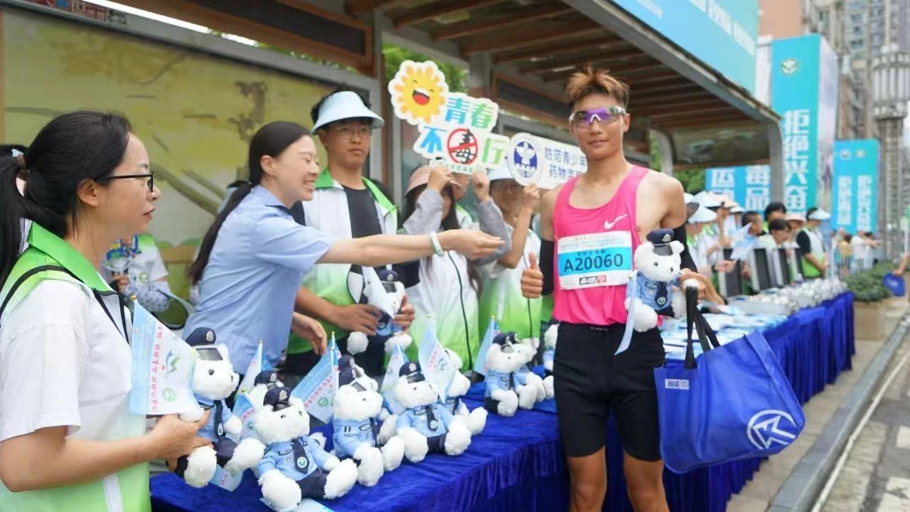 賽道上,各參賽隊(duì)伍蓄勢(shì)待發(fā),隨著開賽槍聲響起,參賽隊(duì)員與廣大跑者一起向著終點(diǎn)破風(fēng)前行,在隊(duì)伍行進(jìn)中,由禁毒民警、志愿者組成的“禁毒反興奮劑宣傳志愿服務(wù)隊(duì)”高聲呼喊禁毒和反興奮劑口號(hào),積極傳遞全民禁毒理念。