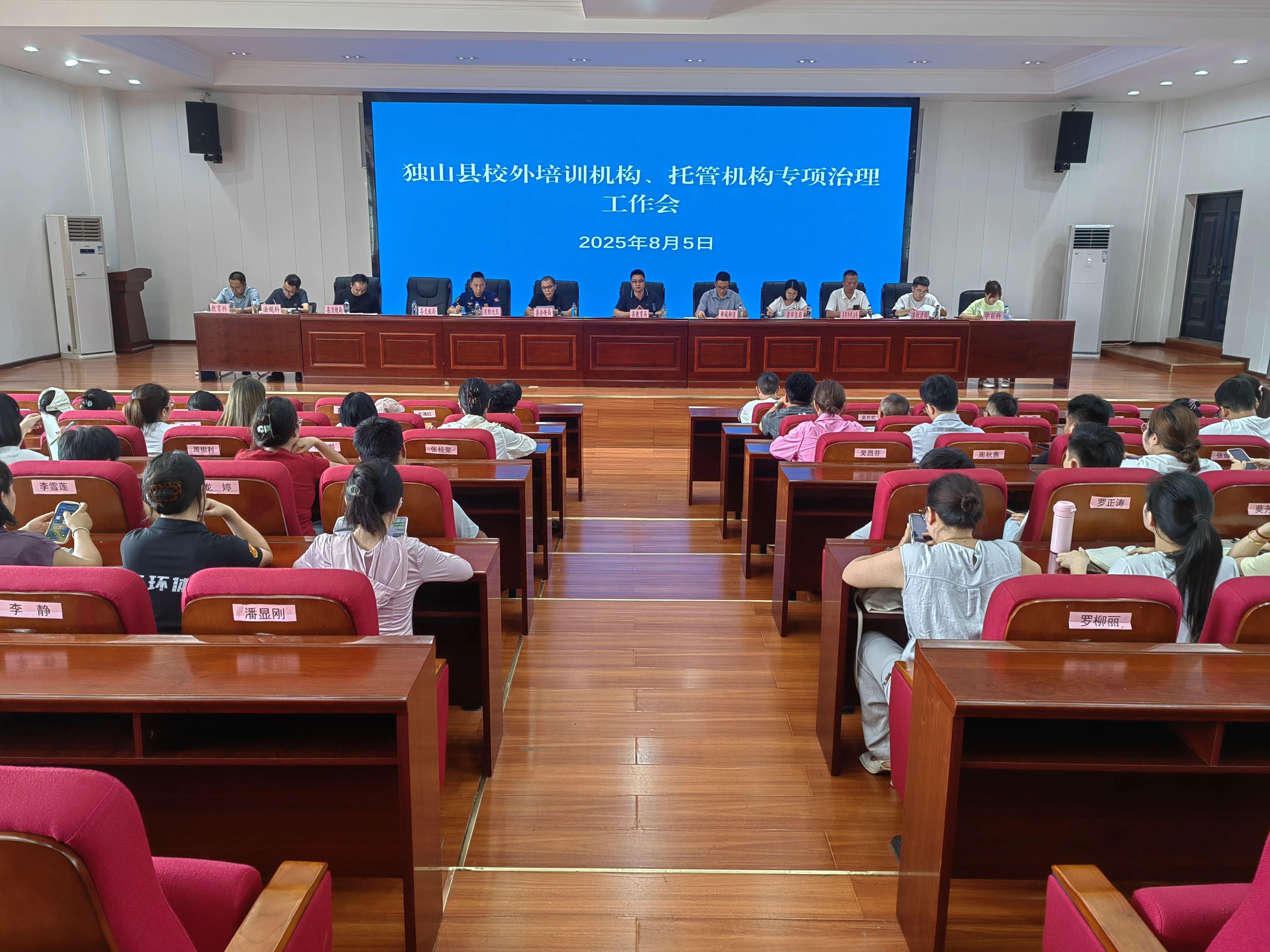 為深入貫徹落實國家“雙減”政策及相關法律法規(guī),切實規(guī)范校外培訓與托管服務市場秩序,保障廣大學生健康安全與合法權益,近日,貴州省黔南州獨山縣教育局組織召開校外培訓機構、托管機構專項治理工作會??h教育局、縣市監(jiān)局、縣文旅局、縣衛(wèi)健局、縣住建局、縣綜合執(zhí)法局、縣消防救援大隊、井城街道等多部門分管負責人,以及全縣所有校外培訓機構、托管機構負責人共100余人參會。