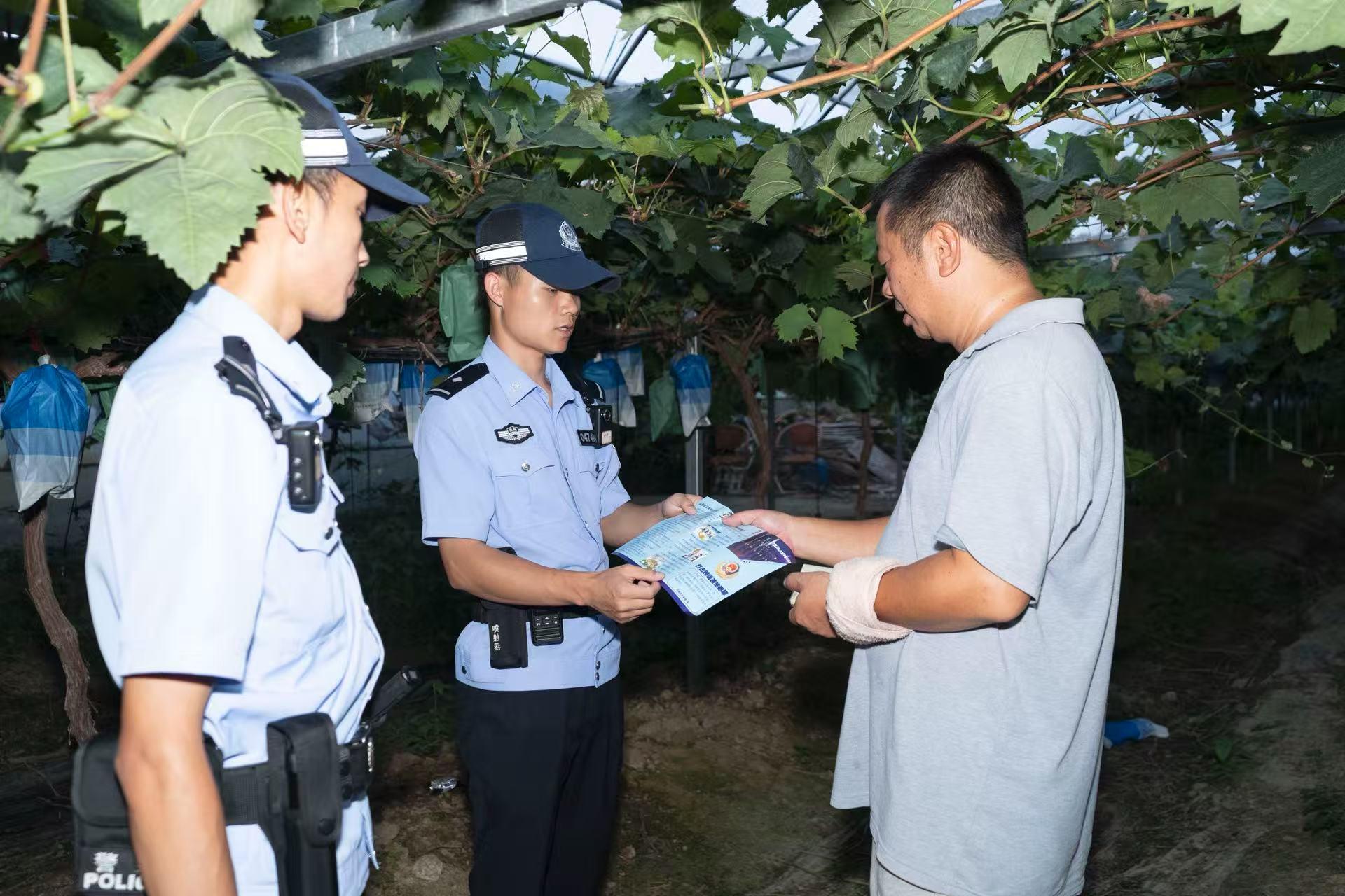 九月傍晚的塘邊鎮(zhèn),夕陽把葡萄藤的影子拉長,一串串紫瑩瑩的葡萄垂在架下,風(fēng)一吹就飄來甜甜的果香。貴州省黔南州平塘縣公安局塘邊派出所的民警蹲在藤蔓旁,手里還攥著剛幫果農(nóng)李哥摘的一串葡萄,笑著叮囑:“李哥,您家葡萄裝箱后可得把棚門鎖牢實,最近夜里涼,別讓小偷鉆了空子……”說著,他掏出小本子,邊聽李哥說采收時的難處,邊認(rèn)真記著,筆尖在紙上沙沙響。