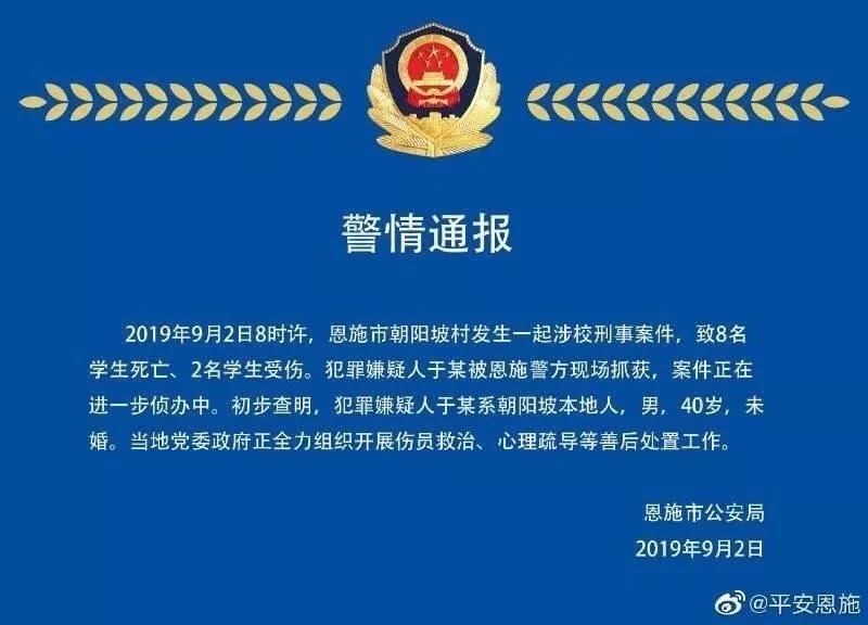 9月2日11時(shí),湖北省恩施市政府官網(wǎng)發(fā)布通報(bào)稱,當(dāng)日8時(shí)許,恩施市白楊坪鎮(zhèn)朝陽坡小學(xué)發(fā)生一起傷人事件,有10名學(xué)生受傷。該消息經(jīng)主流媒體轉(zhuǎn)載后震驚輿論場(chǎng),網(wǎng)民驚呼“血色開學(xué)日”。當(dāng)日晚22時(shí),“@平安恩施”發(fā)布通報(bào)稱,目前有8名學(xué)生死亡、2名學(xué)生受傷,犯罪嫌疑人于某系本地人,40歲,未婚。通報(bào)發(fā)出不久被刪除,引發(fā)網(wǎng)民追問,官方信息管控措施遭到輿論批評(píng)。隨后,《南方周末》等媒體介入報(bào)道,有關(guān)嫌疑人犯罪前科、服刑減刑經(jīng)歷等細(xì)節(jié)被曝光,關(guān)于其作案動(dòng)機(jī)的猜測(cè)充斥網(wǎng)絡(luò)。該案發(fā)生后,國(guó)家衛(wèi)健委派出應(yīng)急專家組,開展受傷學(xué)生醫(yī)療救治等工作,公安部、教育部部署加強(qiáng)中小學(xué)、幼兒園安全工作。目前,案件暫未有最新進(jìn)展公布。