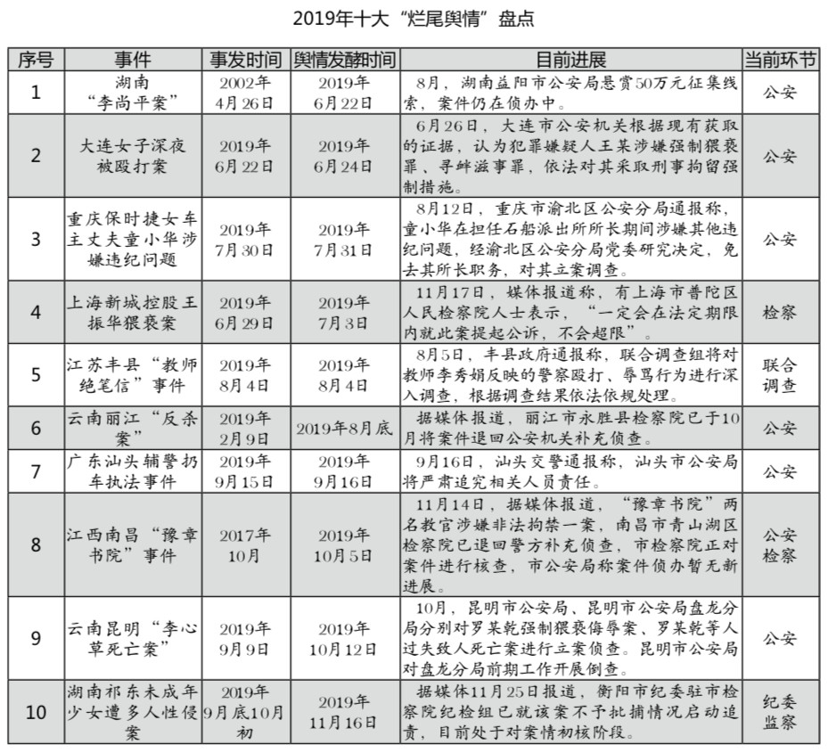 編者按:今年的網(wǎng)絡(luò)輿論場(chǎng)并不平靜,多起涉政法事件引爆輿論場(chǎng),并發(fā)酵成為全網(wǎng)關(guān)注的熱點(diǎn)輿情,引發(fā)輿論震動(dòng)。如備受輿論矚目的孫小果案、鄧世平案,從曝光之日起,就牽動(dòng)著無數(shù)輿論目光。近日,相關(guān)涉案人員陸續(xù)受審獲刑,背后的“保護(hù)傘”也被立案調(diào)查。這類重大輿情事件不“爛尾”,體現(xiàn)出各級(jí)政法機(jī)關(guān)依法履行職責(zé)的自覺和擔(dān)當(dāng),值得稱道。然而也需看到,2019年接近尾聲,仍有不少輿情事件沒有掃尾,輿論場(chǎng)還遺留大量問號(hào)等待拉直。近年來,政法網(wǎng)絡(luò)輿情回應(yīng)率穩(wěn)步提升的前提下,輿情事件的處置完結(jié)率卻忽高忽低,2019年上半年不到六成事件有最終結(jié)果,遠(yuǎn)低于2018年全年75%的比率。鑒于此,法制網(wǎng)輿情中心(ID:fzwyqzx)盤點(diǎn)這一年的重大政法輿情事件,梳理出那些長時(shí)間沒有進(jìn)展和結(jié)果的“爛尾輿情”,并通過分析其類型、總結(jié)其特征、剖析其危害,提出規(guī)避與應(yīng)對(duì)的建議,以供有關(guān)部門參考借鑒。
