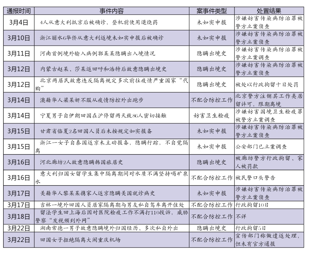 當(dāng)前,國(guó)內(nèi)疫情防控形勢(shì)持續(xù)向好,海外疫情卻在加速蔓延,一些境外人員和海外留學(xué)生選擇回國(guó)避疫,“外防輸入”成現(xiàn)階段疫情防控工作的重中之重。在此關(guān)鍵時(shí)期,少數(shù)人員采取各種手段隱瞞出境史或隱瞞病情,不遵守防疫、隔離等規(guī)定,妨害疫情防控秩序,給我國(guó)的疫情防控工作帶來巨大壓力,引發(fā)輿論高度關(guān)注。法制網(wǎng)輿情中心(ID:fzwyqzx)選取3月以來熱度較高的16起個(gè)案,簡(jiǎn)要分析其類型和處置結(jié)果,梳理輿論觀點(diǎn),并就后續(xù)處置提出應(yīng)對(duì)建議。