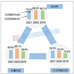 從回應主體來看,與2020年相比,由涉事部門進行回應的事件數(shù)量占比有所增加,達到62.9%,表明涉事主體主動作為的積極性有所提升;而上級主管部門介入回應的比重下降了近7個百分點,側面反映出涉事部門輿情應對能力在逐步精進,能夠較為及時遏制輿情擴散和波及的范圍,一定程度上減輕了級主管部門的應對壓力。同時,第三方回應的事件數(shù)量比重也略微提升了約2個百分點,顯示出不少輿情事件呈現(xiàn)復雜化特征,牽涉主體逐漸多元化并且覆蓋多個領域系統(tǒng),這對部門間的協(xié)調銜接工作也提出了更高的要求。此外政法機關內部多主體回應的情況稍有減弱,相關案例所占比重較2020年減少了一半以上,為4.9%。