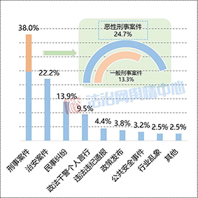 涉法輿情事件158起,占比95.2%。由刑事案件引發(fā)的輿情占比最高,達38.0%,其中惡性刑事案件占比24.7%,一般刑事案件占比13.3%。治安案件、民事糾紛、違紀違法通報引發(fā)的輿情分別占比22.2%、13.9%、4.4%。民事糾紛中,涉及婚姻問題尤其離婚的案事件同比較多,如福建連城縣法院發(fā)出首張“離婚冷靜期通知書”、湖南女子5年4次起訴離婚均被駁回、全國首例家庭勞務補償案宣判等。政策發(fā)布、公共安全事件引發(fā)的輿情分別占比3.8%、3.2%。此外,教育等行業(yè)亂象波及政法機關的輿情占比2.5%,其他輿情事件占比2.5%。