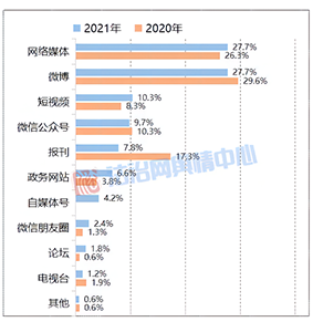 2021年,網(wǎng)絡媒體與微博仍為政法輿情最主要的“策源地”,自兩平臺初步曝光進而發(fā)酵的輿情事件數(shù)量占比超55%。發(fā)酵于短視頻平臺的政法輿情占比自2019年以來出現(xiàn)“兩連漲”,僅次于網(wǎng)絡媒體和微博。相比之下,源自報刊、電視臺等傳統(tǒng)媒體的輿情占比持續(xù)減少,尤其是源于報刊的輿情大幅減少,數(shù)量占比自上一年度的17.3%銳減為7.8%。