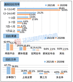 從回應(yīng)主體來(lái)看,與2020年相比,由涉事部門進(jìn)行回應(yīng)的事件數(shù)量占比有所增加,達(dá)到62.9%,表明涉事主體主動(dòng)作為的積極性有所提升;而上級(jí)主管部門介入回應(yīng)的比重下降了近7個(gè)百分點(diǎn),側(cè)面反映出涉事部門輿情應(yīng)對(duì)能力在逐步精進(jìn),能夠較為及時(shí)遏制輿情擴(kuò)散和波及的范圍,一定程度上減輕了級(jí)主管部門的應(yīng)對(duì)壓力。同時(shí),第三方回應(yīng)的事件數(shù)量比重也略微提升了約2個(gè)百分點(diǎn),顯示出不少輿情事件呈現(xiàn)復(fù)雜化特征,牽涉主體逐漸多元化并且覆蓋多個(gè)領(lǐng)域系統(tǒng),這對(duì)部門間的協(xié)調(diào)銜接工作也提出了更高的要求。此外政法機(jī)關(guān)內(nèi)部多主體回應(yīng)的情況稍有減弱,相關(guān)案例所占比重較2020年減少了一半以上,為4.9%。
