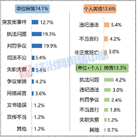 從輿情類型來(lái)看,責(zé)任主體分為三個(gè)層面:涉及政法單位的輿情占比74.1%,涉及政法干警個(gè)人的輿情占比12.7%,涉及單位和個(gè)人的復(fù)合輿情占比13.3%。