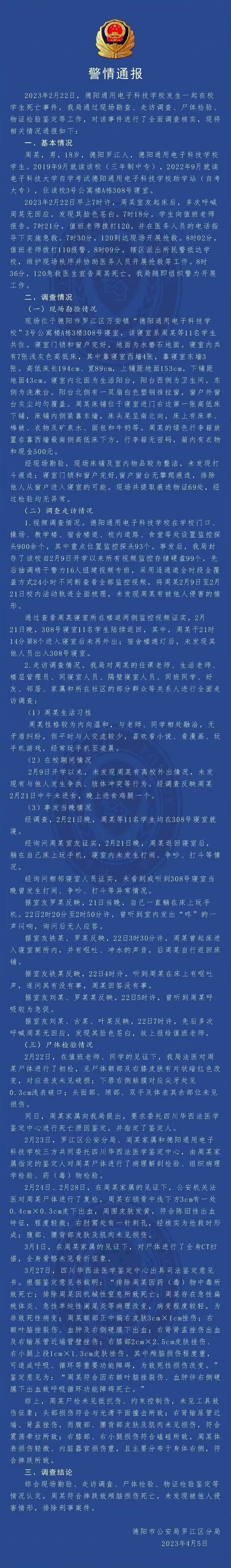 4月5日,“@羅江警方”在微博平臺發(fā)布長篇警情通報,圍繞事件調查情況,詳細披露了警方現(xiàn)場勘查、走訪調查、尸體檢驗、物證檢驗鑒定等工作的具體細節(jié)。通報中提及:警方抽調精干警力16人全面梳理周某自2月9日該校開學后的校內活動軌跡,未發(fā)現(xiàn)周某有被他人侵害的情形;尸檢結果顯示,周某腎部損傷系震蕩牽拉導致,肘部針刺孔為搶救時形成,體表損傷輕微且主要集中于一側,符合摔跌所致;周某多名室友證實,事發(fā)當晚“寢室內曾有‘咚’的一聲悶響”“周某起床嘔吐后自行返回床鋪”等情形,進一步佐證周某系摔跌受傷后自行臥床的結論。