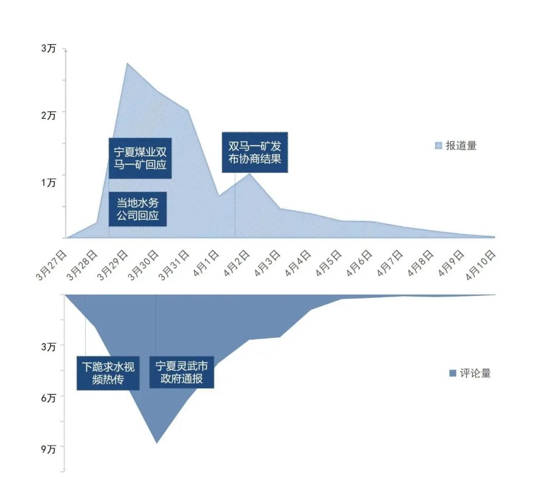 3月29日,部分中央主流媒體發(fā)聲表態(tài):“@中國新聞網(wǎng)”稱“‘缺水’的輿論場需要真相甘霖”;央廣網(wǎng)推出文章《萬畝治沙林被煤礦“斷水”?供水和調(diào)查必須馬上到位》,指出當(dāng)?shù)乇仨毐M快用客觀公正的調(diào)查還原真相,給林場主一個交代,給萬畝林場一個交代,也給公眾一個交代。輿論場還曝光一份判決書,顯示寧夏回族自治區(qū)銀川市中院曾作出判決,明確該煤礦占用林地,要求賠償孫國友727.54萬元。另據(jù)九派新聞報道,當(dāng)?shù)厮畡?wù)公司負責(zé)人稱,礦場污水處理達標(biāo),但是水的鹽分過高澆不了樹。煤礦一方稱,污水處理設(shè)備容量比較小,每天只能處理兩千立方,且資金成本太大,不想加大投入。靈武市政府相關(guān)人員向媒體表示,正在針對此事協(xié)調(diào)處理。當(dāng)日,“#萬畝樹木被煤礦斷水面臨枯死#”“#水務(wù)公司回應(yīng)萬畝林場主跪地求供水#”等相關(guān)微博話題沖上熱搜榜前列,輿情熱度達到峰值。部分網(wǎng)民表示,經(jīng)歷了沙塵暴,才能真正明白造林治沙的好處和難處,“不能讓好人流汗流淚又流血”。微博大V“@胡錫進”也呼吁,希望不用下跪崩潰引起巨大輿情也能正常解決。