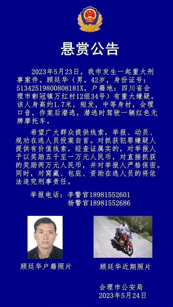 5月24日,四川涼山州會理市公安局發(fā)布懸賞公告稱,5月23日,會理市發(fā)生一起重大刑事案件,顧延華有重大嫌疑。公告詳細(xì)描述了嫌疑人的體貌特征、逃逸時使用的交通工具以及獎勵金額等。然而,這則常見的懸賞公告卻在社交媒體上引發(fā)網(wǎng)民熱議,相關(guān)微博話題閱讀量達(dá)到2.5億人次。不少網(wǎng)民追問案件到底有多重大,不滿警方為何不在公告中描述詳細(xì)案情。還有一些網(wǎng)民認(rèn)為嫌疑人如此危險,警方卻鼓勵群眾抓捕,這種方式不妥。對此,會理警方并未予以明確回應(yīng),輿情熱度隨后逐步下降。