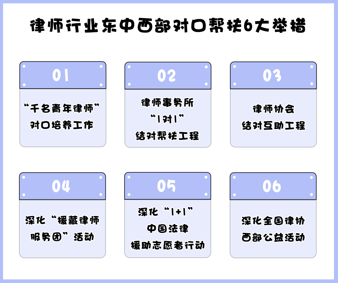 為有效推進(jìn)律師行業(yè)東中西部對口幫扶工作,《關(guān)于建立健全律師行業(yè)東中西部對口幫扶機(jī)制的方案》列舉了如下措施。