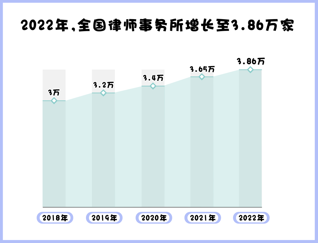 據(jù)司法部發(fā)布的官方數(shù)據(jù)顯示,截至2022年底,全國執(zhí)業(yè)律師已達(dá)65.16萬多人,全國律師事務(wù)所數(shù)量已經(jīng)增長至3.86萬家,我國律師隊伍不斷壯大。