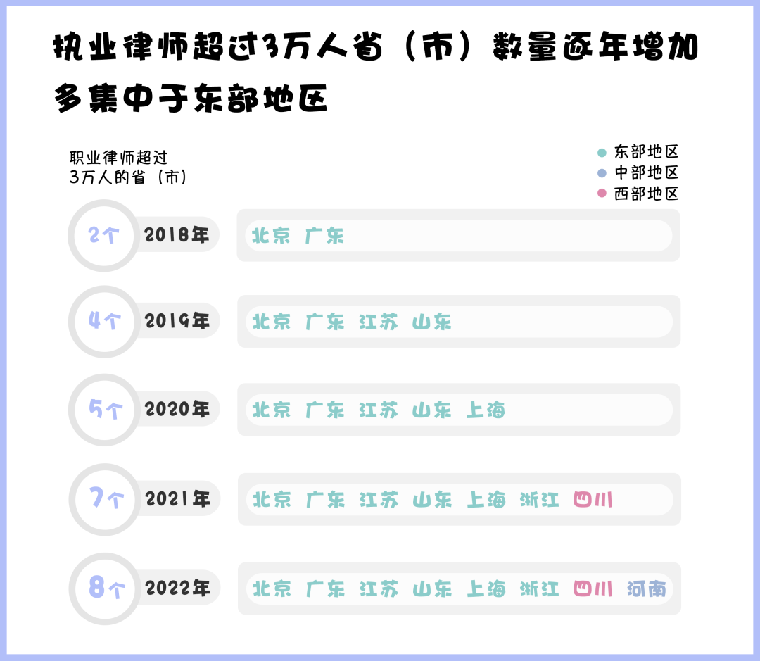 從司法部發(fā)布的數(shù)據(jù)來看,近五年來,律師人數(shù)超過3萬人的省(市)數(shù)量持續(xù)上漲,截至2022年底,共有8個?。ㄊ校┑穆蓭熑藬?shù)超過3萬,其中除河南、四川外,其余?。ㄊ校┚植荚跂|部地區(qū)。