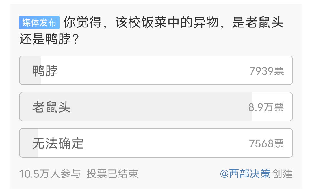 大量網(wǎng)民質(zhì)疑當?shù)叵嚓P部門“指鼠為鴨”。據(jù)“@西部決策”發(fā)起的一項超10萬人參與的微博投票顯示,近九成網(wǎng)民認為食堂中的異物為“鼠頭”,不少科普博主、微博大V還有媒體均就此事發(fā)表評論,輿論場基調(diào)以追問和批評為主。6月6日上午,微博話題“#長牙的鴨脖令人如鯁在喉#”沖上熱搜榜第一位。另據(jù)《河南商報》報道,有網(wǎng)民爆料該校一教職工疑似要求學生針對此事進行“控評”。輿論場上,除了批評校方說謊、隱瞞等聲音之外,還有網(wǎng)民疑惑市場監(jiān)管部門為何替學?!罢九_”,猜測背后存在利益輸送等問題;也有網(wǎng)民拍攝視頻解釋稱,鴨脖在某個角度看起來很像老鼠頭;更多網(wǎng)民呼吁當?shù)乇O(jiān)管部門拿出更多檢測證據(jù)來。
