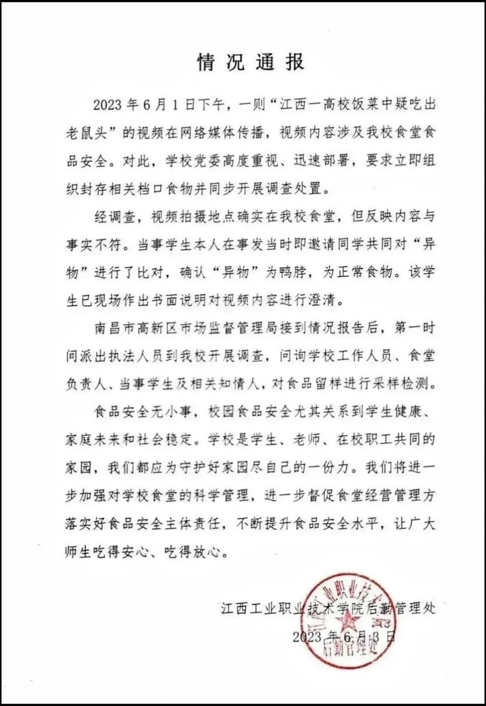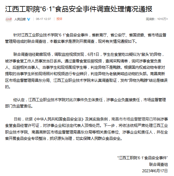 6月2日,據(jù)“@沸點視頻”稱,6月1日,網(wǎng)曝江西工業(yè)職業(yè)技術(shù)學院學生吃飯吃出來老鼠頭。據(jù)抖音短視頻顯示,一男子告知食堂工作人員吃出來老鼠頭,工作人員表示“是鴨肉”。報道稱,涉事的學校餐飲公司南昌市菁禾餐飲工作人員表示“已經(jīng)看到視頻了,會去調(diào)查核實處理”。隨后“@頭條新聞”等賬號轉(zhuǎn)載該新聞,部分網(wǎng)民留言評論表示“不信”,并調(diào)侃稱“說是鴨肉的那個讓他吃掉”。