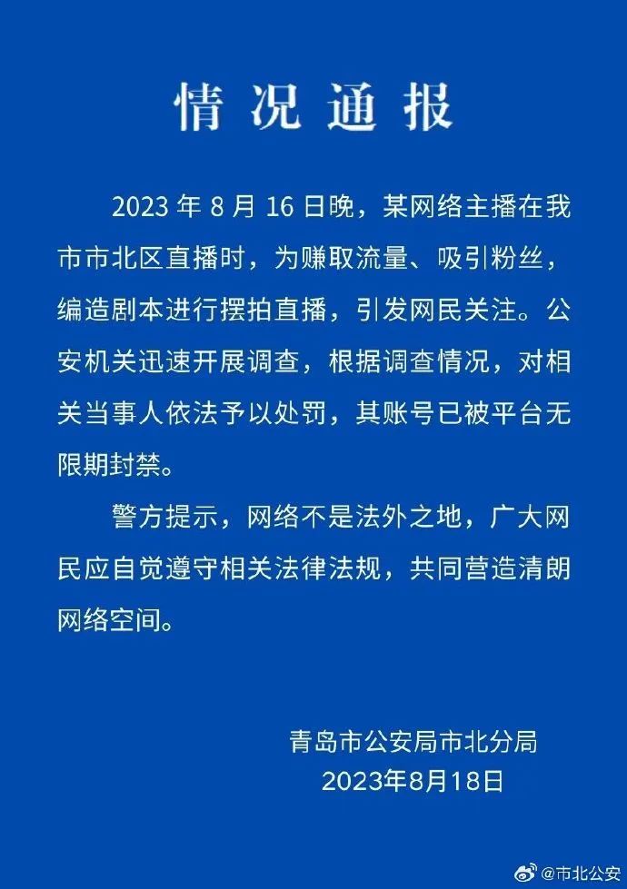 8月18日,青島市公安局市北分局微博賬號“@市北公安”通報稱,某網(wǎng)絡(luò)主播在青島市市北區(qū)直播時,為賺取流量、吸引粉絲,編造劇本進行擺拍直播。公安機關(guān)對相關(guān)當(dāng)事人依法予以處罰,其賬號已被平臺無限期封禁?!?二驢#”“#警方通報網(wǎng)傳二驢直播被綁架#”等多個話題閱讀量近6.7億。輿論對此結(jié)果表示認同,評論稱“山東警方果斷調(diào)查處置,結(jié)果大快人心”。