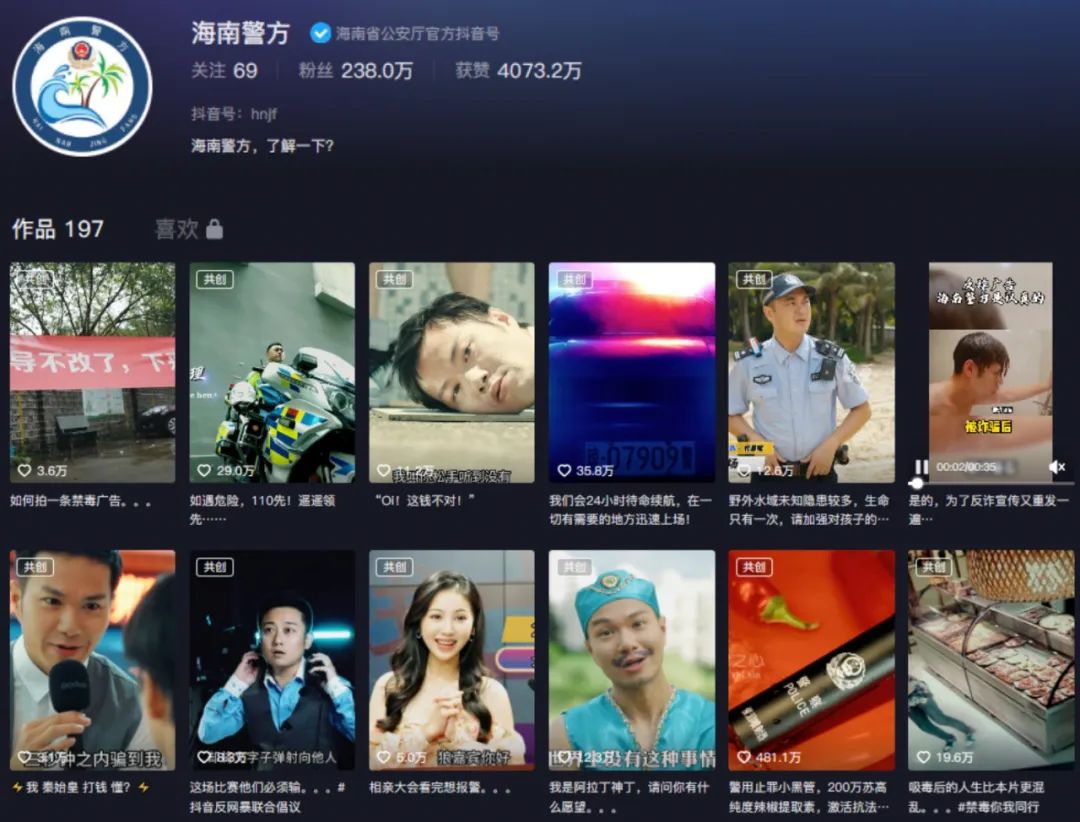 6月6日,海南省公安廳官方賬號“海南警方”在抖音、快手、微博等多個平臺發(fā)布了一則普法視頻,以廣告拍攝的手法介紹“警用酒精測試儀”性能,告誡司機切勿酒后駕車。該視頻一經發(fā)布就收獲網民的廣泛好評,在各個平臺累計播放量超過3300萬次,點贊量超過580萬。不少網民表示視頻內容幽默風趣,積極支持官方大膽“整活”反套路的行為,并在評論區(qū)與警方互動。此后,在7月8日和8月28日,“海南警方”相繼發(fā)布兩條風格一致的短視頻,用相同的方式介紹了警用催淚噴射器和警車等裝備,再度成功“出圈”,各平臺點贊量累計接近800萬,獲得“@人民日報”“@央視新聞”等主流媒體的報道和轉發(fā),微博話題“#海南警方高奢普法廣告又來了#”“#海南警方普法廣告對警車下手了#”等閱讀量累計超過3500萬人次,登上熱搜榜。該題材還獲得其他政務賬號的爭相模仿。除此之外,“海南警方”大膽嘗試各種風格,打造出《反詐版拆彈專家》《用港片的方式打開交通安全》等多個創(chuàng)意短視頻,均收獲不錯的播放成績,贏得網民認可。《工人日報》評論文章對此表示充分贊賞和肯定,稱希望此類“高端”普法和官方“整活”可以更多一些。截至9月14日12時,全網相關信息量5.6萬余條,微博話題“#海南警方高奢普法廣告又來了#”“#海南警方魔性反詐廣告#”等累計閱讀量超3億。