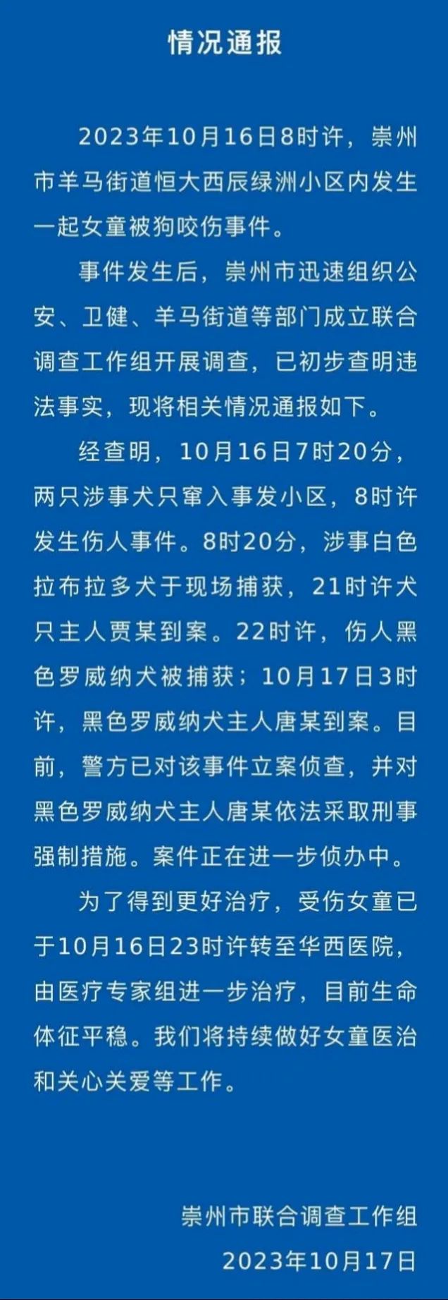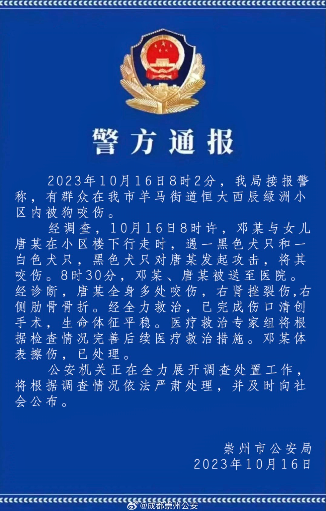 事發(fā)當日17時許,崇州公安發(fā)布首份通報,稱被咬女童生命體征平穩(wěn),正全力展開調(diào)查處置工作。輿論場中不少網(wǎng)民探究事發(fā)原因,認為養(yǎng)犬規(guī)定落實不到位,導致遛狗不牽繩、飼養(yǎng)烈性犬等亂象出現(xiàn)。10月17日,據(jù)受傷女童母親透露,涉事黑犬已被找到,警方還在排查狗主人。另有媒體報道稱,成都禁養(yǎng)22種烈性犬不包括羅威納,部分網(wǎng)民對警方工作效率表達不滿情緒。