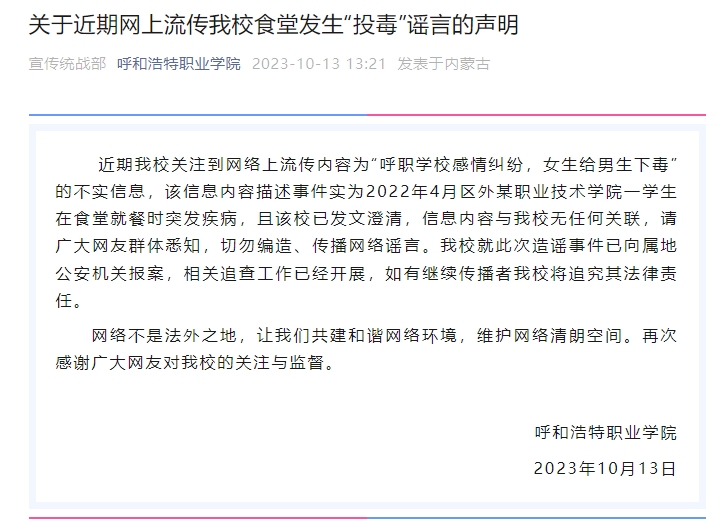 【典型案例】自10月初,連續(xù)有網(wǎng)民在社交媒體發(fā)視頻稱,呼和浩特職業(yè)學(xué)院發(fā)生悲劇,一名男生因感情糾紛被女生下毒致死,引發(fā)社會(huì)關(guān)注。10月13日,該校發(fā)布了一份聲明,澄清這條信息不實(shí),與學(xué)校無任何關(guān)聯(lián)。據(jù)悉,網(wǎng)絡(luò)流傳的視頻中描述的事件實(shí)為2022年4月江蘇南京交通職業(yè)技術(shù)學(xué)院一學(xué)生在食堂就餐時(shí)突發(fā)疾病 ,并非因?yàn)榕露?。而且,江蘇南京交通職業(yè)技術(shù)學(xué)院在當(dāng)時(shí)就已經(jīng)發(fā)布了相關(guān)澄清。再如,10月18日,網(wǎng)傳江蘇南京有男子在酒吧外性侵一名醉酒女子。當(dāng)日,事發(fā)地所屬南京市警方相關(guān)工作人員回應(yīng)稱,警方已查清此事,沒有性侵,網(wǎng)傳情況有夸大成分。另據(jù)警方透露,某社交網(wǎng)站流傳的不實(shí)消息,“是專門的AI軟件寫的”。