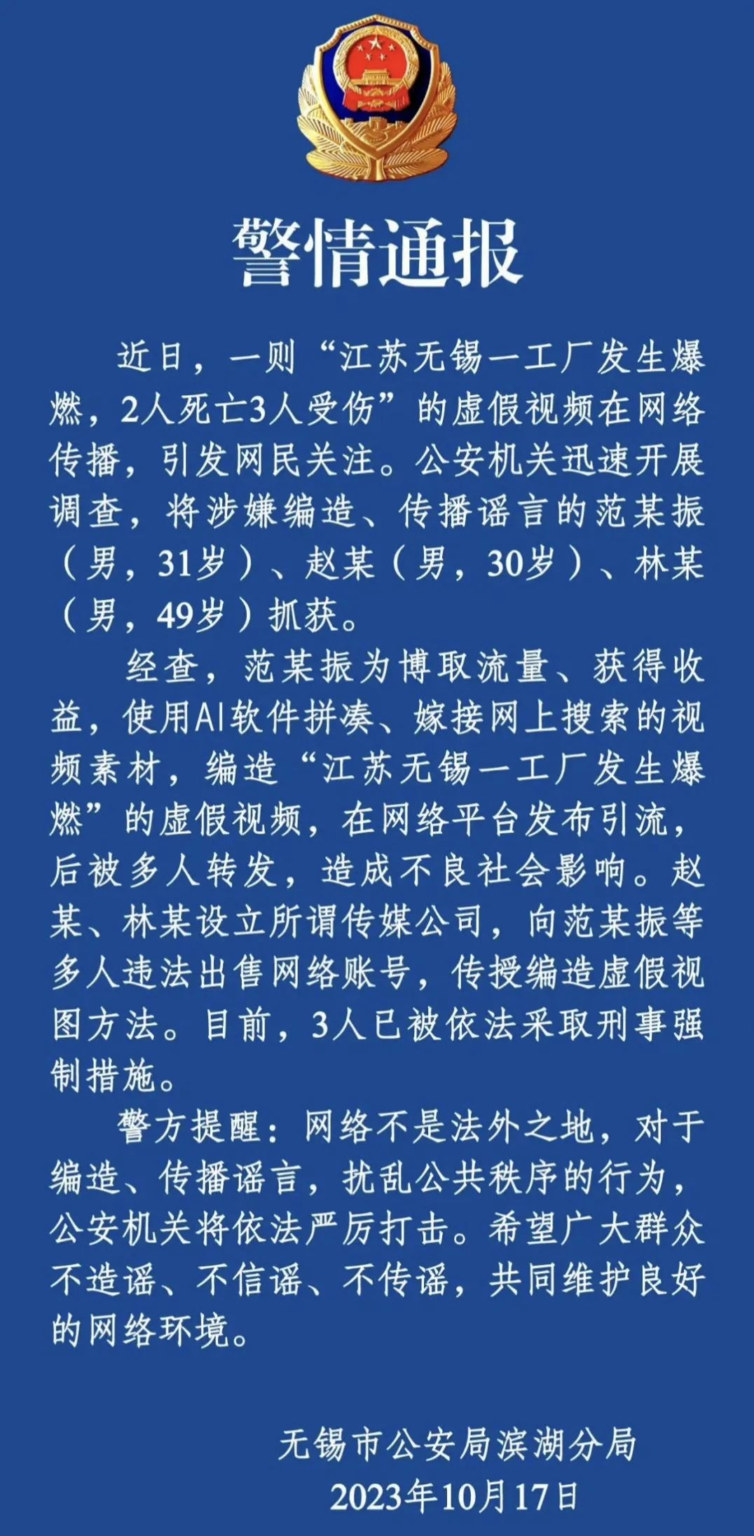 【典型案例】10月17日,一則“江蘇無錫一工廠發(fā)生爆燃,2人死亡3人受傷”的虛假視頻在網(wǎng)絡(luò)傳播,引發(fā)網(wǎng)民關(guān)注。當(dāng)日20時(shí)許,無錫市公安局濱湖分局微信公眾號(hào)“濱湖警事”發(fā)布警情通報(bào),稱此為一起謠言事件,已經(jīng)將造謠、傳謠的范某、趙某、林某三人抓獲。經(jīng)查,范某為博取流量、獲得收益,使用AI軟件拼湊、嫁接網(wǎng)上搜索的視頻素材,編造相關(guān)虛假視頻,在網(wǎng)絡(luò)平臺(tái)發(fā)布引流,后被多人轉(zhuǎn)發(fā),造成不良社會(huì)影響。趙某、林某設(shè)立所謂傳媒公司,向范某等多人違法出售網(wǎng)絡(luò)賬號(hào),傳授編造虛假視圖方法。