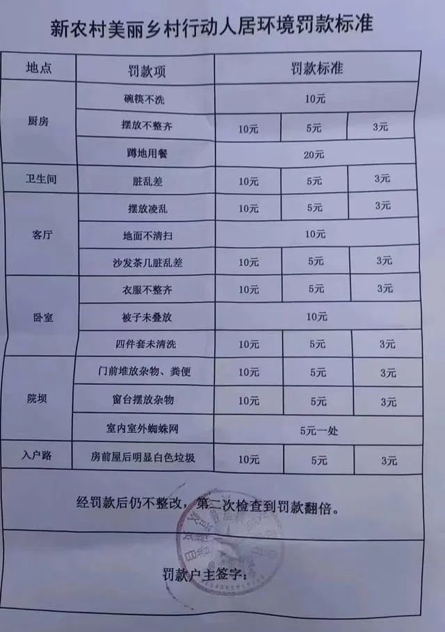據(jù)央廣網(wǎng)報(bào)道,《罰款標(biāo)準(zhǔn)》共涉及14條人居環(huán)境罰款標(biāo)準(zhǔn),罰款項(xiàng)包括碗筷不洗、蹲地用餐、衛(wèi)生間臟亂差、被子未疊、臥室四件套未清洗等,罰款金額從3元到20元不等。該村黨支部書記回應(yīng)稱,該標(biāo)準(zhǔn)是為了糾正懶散村民的行為,還沒正式開始實(shí)施,仍在宣傳階段。當(dāng)?shù)卮迕裎瘑T會(huì)以罰代管一事引發(fā)輿論廣泛關(guān)注。