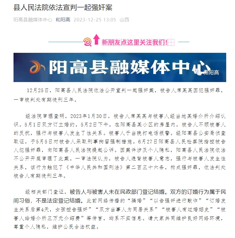 2023年12月25日13時許,陽高縣融媒體中心微信公眾號“和陽高”通報此案審理情況。通報指出,經法院審理查明,2023年1月30日,被告人與被害人經當地某婚介所介紹認識。5月1日雙方訂立婚約。5月2日下午,在陽高縣某小區(qū)的房屋內,被告人不顧被害人反抗,強行與被害人發(fā)生了性關系。被害人于當晚打電話報警。經陽高縣公安局偵查取證,于5月5日對被告人采取刑事拘留強制措施。經相關部門查證,被告人與被害人未在民政部門登記結婚。雙方的訂婚行為屬于民間習俗,不是法定登記結婚。此前,此前網絡傳播的“騙婚”“以告強奸進行敲詐”等多個傳言,均系不實信息。這一通報初步回應了多個輿論關切點,網民觀點開始出現扭轉,部分網民指出訂婚不等于同意發(fā)生性關系。