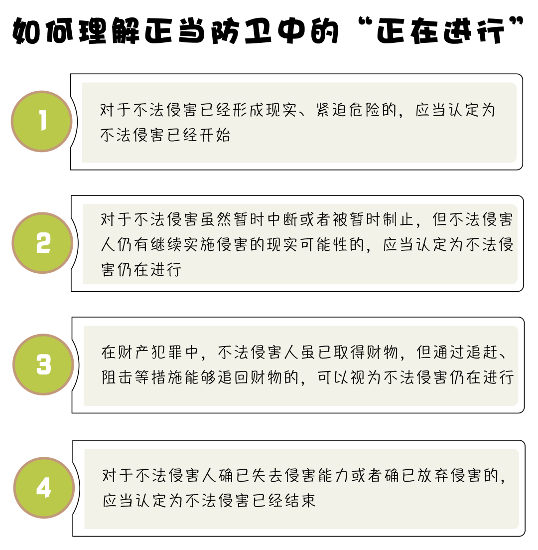 《關(guān)于依法適用正當(dāng)防衛(wèi)制度的指導(dǎo)意見(jiàn)》明確規(guī)定,正當(dāng)防衛(wèi)必須是針對(duì)“正在進(jìn)行”的不法侵害。