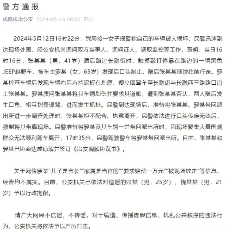 5月13日8時許,成都市成華區(qū)警方發(fā)布通報介紹事發(fā)過程,稱5月12日16時許,張某某(男,41歲)酒后觸摸敲打??吭诼愤叺牧_某(女,65歲)的車,雙方發(fā)生口角抓扯。張某某拒不配合、執(zhí)意離開,民警依法進行口頭傳喚無效后,強制將其帶離現(xiàn)場。民警準備將羅某及其車輛一并帶回派出所時,因現(xiàn)場聚集大量圍觀群眾無法順利駕車離開。目前,雙方已協(xié)商達成諒解并簽訂調(diào)解書,網(wǎng)傳羅某“要求賠償一萬元”“被現(xiàn)場放走”等信息均不屬實,公安機關(guān)已依法對造謠的張某和饒某某予以行政拘留。該通報被光明網(wǎng)、“@四川日報”等媒體轉(zhuǎn)發(fā)后帶動輿情升溫,“#警方通報男子摸車被索賠1萬#”等熱搜話題閱讀量累積近8000萬次。部分網(wǎng)民調(diào)侃車主“神通廣大”,吐槽“以后停在路邊的車別亂摸”;有網(wǎng)民對通報內(nèi)容表示懷疑,追問為何“把吉普車圍起來”等,還有網(wǎng)民呼吁公開現(xiàn)場監(jiān)控。“@作家劉小?!薄癅無心簡影”等大V則力挺成都警方,反問“成都市長快60的人了,怎么可能有個65歲的媽”“難道不是因為現(xiàn)場有人煽動造成人員聚集,怕現(xiàn)場失控才來了這么多警察嗎”。