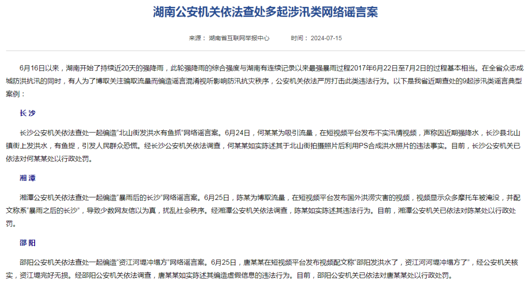 二是夸大災(zāi)情險情。此類謠言主要通過捏造數(shù)據(jù)、刻畫細(xì)節(jié)、綁架“官方”等伎倆,夸大災(zāi)情險情,增強(qiáng)謠言的“可信度”。較為常見的是利用聳人聽聞的傷亡數(shù)據(jù)捏造受災(zāi)嚴(yán)重的假象,招致人心惶惶。如湖南暴雨期間,常德市一網(wǎng)民在短視頻平臺發(fā)布居住地附近漲水視頻,編造稱“俺這里天天下雨,天天死人,半個月,三四十個人”,瀏覽量迅速破10萬次,遭到行政處罰;平江縣一網(wǎng)民在微信平臺造謠稱“很多尸體隨汨羅江被沖走,3萬多人不見了”被行政拘留。四川暴雨期間,曾某某在抖音平臺編造“達(dá)州洪災(zāi)致4人死亡1人失聯(lián)”虛假信息被行政處罰等。再者,謠言詳細(xì)說明災(zāi)害時間、地點(diǎn)及經(jīng)過等,給人一種如臨現(xiàn)場之感,難辨真假。如賬號“正能量實(shí)事說事”謊稱“岳陽市君山區(qū)許市鎮(zhèn)的堤防突然決口,洪水傾瀉而入,瞬間淹沒大片農(nóng)田和村莊,數(shù)千名群眾被洪水圍困,消防、武警等救援力量正展開緊急救援”。隨著文章在各大社交平臺擴(kuò)散,恐慌情緒蔓延至線下,一些商家趁機(jī)哄抬物價,部分家庭甚至開始準(zhǔn)備撤離。還有網(wǎng)民模仿權(quán)威發(fā)布,使用“嚴(yán)峻”“危急”等標(biāo)題,煽動恐慌情緒。如廣西桂林遭遇超歷史紀(jì)錄洪水,抖音網(wǎng)民“土豆炒馬鈴薯”發(fā)布一則“情況緊急的新聞通知”造謠稱“接到上級電話,平樂縣新田水庫塌了”,引發(fā)不知情的網(wǎng)民留言追問情況。