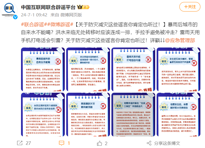 四是涉防災(zāi)減災(zāi)的“偽科學(xué)”信息。此類謠言幾乎年年出現(xiàn),可謂是“老掉牙”謠言,歷經(jīng)反復(fù)辟謠仍表現(xiàn)出較強(qiáng)的生命力,甚至還有個別網(wǎng)民以“親身經(jīng)歷”佐證謠言“屬實(shí)”。如“暴雨過后城市的自來水不能喝”“雷雨天不能打手機(jī)”等相關(guān)話題近期登上微博、百度、抖音等平臺的熱搜榜,有網(wǎng)民跟評稱:“我們這里雷電打電話的被雷劈死好幾個,那是什么原因呢?”