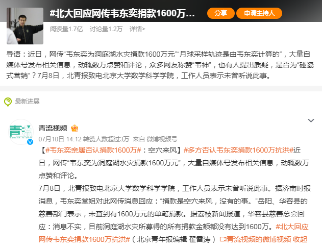 三是捏造救援救助信息。災(zāi)害發(fā)生后,物資調(diào)撥、人員搜救、群眾轉(zhuǎn)移等搶險救援情況被主流媒體持續(xù)報道,吸引輿論廣泛關(guān)注,相關(guān)謠言趁機(jī)流竄,成為傳播主旋律中的雜音。如抖音網(wǎng)民“賓利xx”發(fā)視頻謊稱,河南南陽市臥龍區(qū)陸營鎮(zhèn)王莊村被水淹,臥龍區(qū)使用直升機(jī)進(jìn)行救援。經(jīng)核實(shí),“直升機(jī)救援”一說系虛假信息。網(wǎng)傳“韋東奕(韋神)為洞庭湖水災(zāi)捐款1600萬元”消息引發(fā)關(guān)注,多個相關(guān)視頻獲得數(shù)萬點(diǎn)贊。事后,韋東奕親屬回應(yīng)稱系“假消息”,湖南岳陽市和華容縣慈善部門也表示,未查到有1600萬元的單筆捐款。自媒體這種無底線的“碰瓷式營銷”激起輿論公憤,《新華每日電訊》發(fā)文稱,世上沒有所謂的“正能量謠言”,旗幟鮮明地打擊各類謠言,鏟除造謠傳謠的土壤,才是真正的正能量。《北京晚報》刊文評論稱,給“韋神”貼金是假,靠造謠撈金是真,任短視頻謠言隔三岔五污染視聽,會對整個社會信任體系造成沖擊。