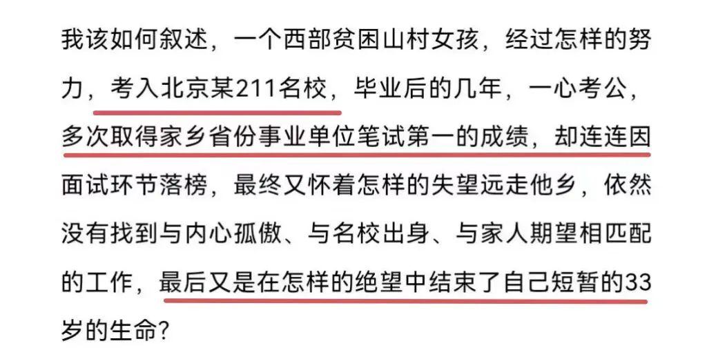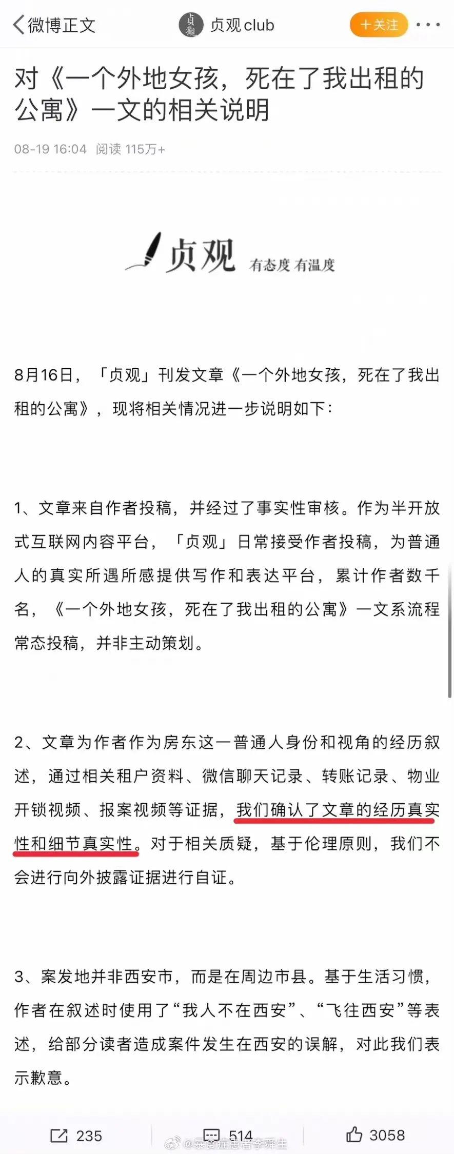 8月16日,微信公眾號“貞觀”發(fā)布一篇作者為“十二橡樹”的文章《一個外地女孩死在了我出租的公寓》。文章稱,今年4月,一名來自寧夏西海固山區(qū)的女孩租住了作者的單身公寓,她畢業(yè)于北京211高校,職業(yè)為會計(jì),當(dāng)時正在陜西西安找工作。女孩畢業(yè)后一心考公,多次取得家鄉(xiāng)省份事業(yè)單位筆試第一的成績,卻一次次在面試環(huán)節(jié)落榜。6月25日,有人發(fā)現(xiàn)女孩疑似餓死在出租屋內(nèi),警方已介入處理。8月18日,“貞觀”以保護(hù)當(dāng)事人為由刪除該文章,并回應(yīng)稱文中所述為真實(shí)事件。8月19日,“貞觀”再次回應(yīng)稱文章來自作者投稿,經(jīng)過事實(shí)性審核,但案發(fā)地并非西安市,而是在周邊市縣。相關(guān)文章在社交平臺上引起熱傳,輿論呈現(xiàn)兩極分化:部分網(wǎng)民表示震驚和悲涼,借此對社會表達(dá)不滿;部分網(wǎng)民則對文內(nèi)相關(guān)細(xì)節(jié)的真實(shí)性提出疑問。