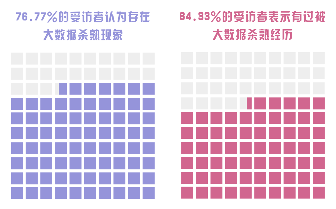 大數(shù)據(jù)殺熟本質(zhì)上是算法的濫用,商家利用消費者的信任以及信息不對稱獲取超額利益,侵害消費者權(quán)益。北京市消協(xié)發(fā)布大數(shù)據(jù)殺熟問題調(diào)查報告顯示,七成多(76.77%)受訪者認(rèn)為存在大數(shù)據(jù)“殺熟”現(xiàn)象,超六成(64.33%)受訪者表示有過被大數(shù)據(jù)殺熟經(jīng)歷。