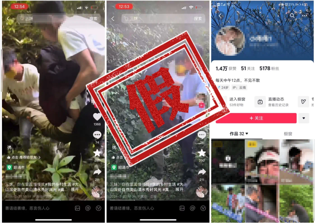“婆媳勢不兩立”“婚姻一地雞毛”等以家庭矛盾為中心、以沖突為賣點(diǎn)的網(wǎng)絡(luò)虛假擺拍視頻并不鮮見,此類視頻往往密集制造沖突,放大家庭矛盾,且臺(tái)詞夸張、情節(jié)曲折。8月28日,抖音發(fā)布近期介入核實(shí)的網(wǎng)絡(luò)虛假擺拍典型案例,博主“是老王家的二姐呀”自稱在14歲至20歲期間被父母包辦3次婚姻,16歲時(shí)就和“大自己30歲的男子”生下兒子,并與幾個(gè)自稱“三妹”“大姐”的賬號互動(dòng)頻繁,以矩陣賬號合力擺拍造假。涉事賬號被平臺(tái)采取封禁處理。10月,貴州畢節(jié)市七星關(guān)區(qū)網(wǎng)警與山東青島市網(wǎng)警先后通報(bào)“外來媳婦遭嫌棄毆打趕出家門后,躲進(jìn)山洞艱苦求生”“臨盆孕婦被丈夫遺棄荒山數(shù)日,孤立無援,無法下山求救”兩起虛假擺拍案例,相關(guān)涉案人員均被當(dāng)?shù)鼐浇o予行政處罰。