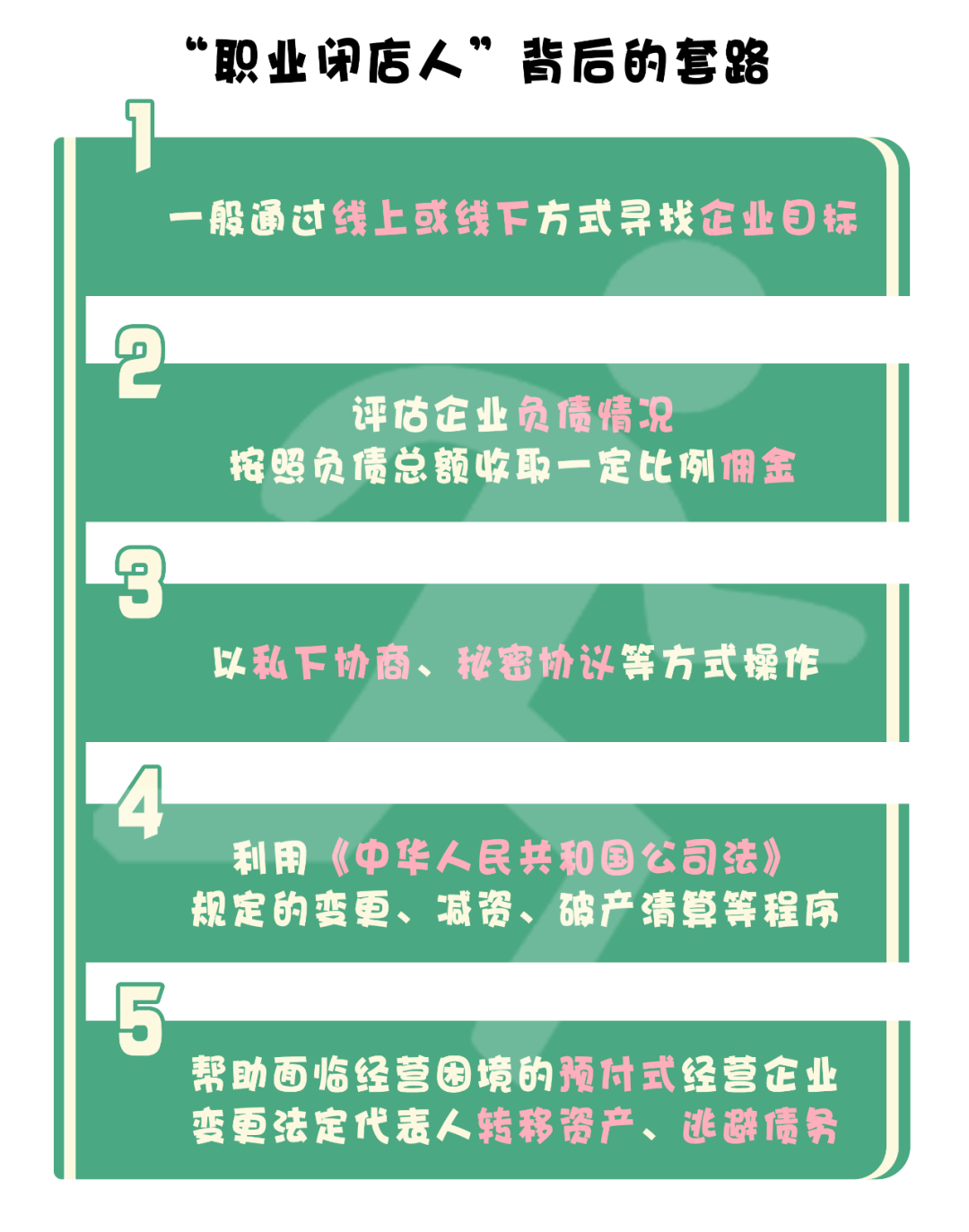 一些中介、機構(gòu)或者個人,通過熟人介紹、自行尋找、在社交平臺發(fā)布“收負(fù)數(shù)店鋪”相關(guān)帖文等方式,與負(fù)債或者經(jīng)營困難的預(yù)付式企業(yè)取得聯(lián)系并建立合作關(guān)系,評估企業(yè)負(fù)債情況收取傭金,利用法律程序?qū)ⅰ奥殬I(yè)閉店人”變更為新的法定代表人,協(xié)助負(fù)債或者經(jīng)營不善的企業(yè)跑路。與此同時,被欺騙的消費者只能看著“一地雞毛”暗自神傷,礙于維權(quán)困難只能默默吞下苦果。