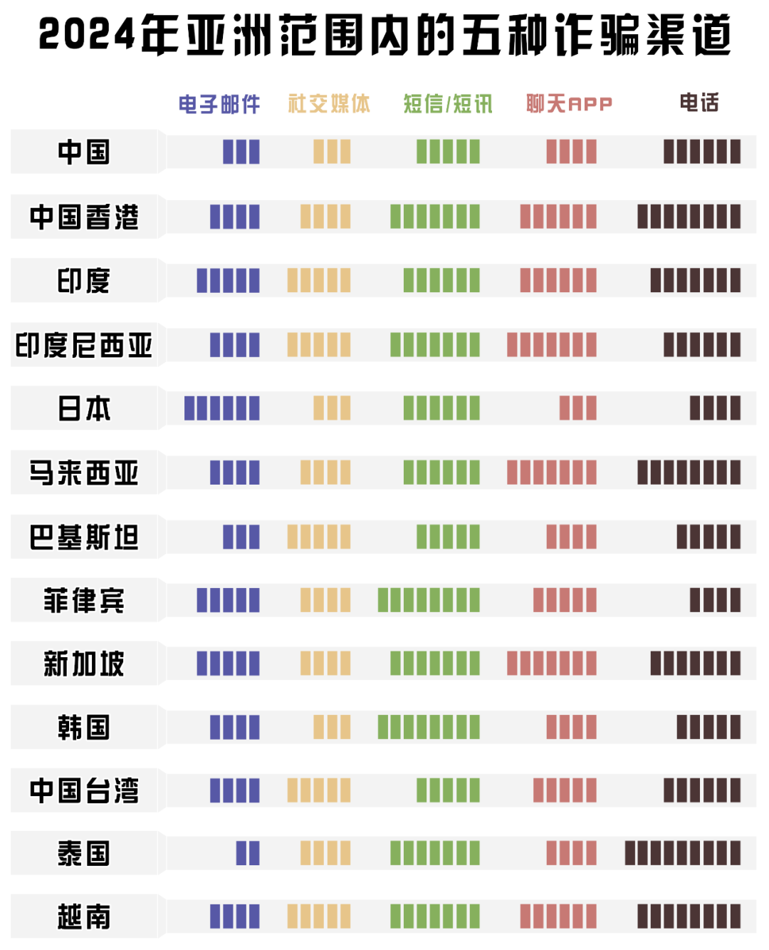 從GASA發(fā)布的《2024年亞洲詐騙報(bào)告》來看,在13個(gè)國家及地區(qū)中,犯罪分子實(shí)施詐騙的渠道通常有如下五種:電子郵件、社交媒體、短信及短訊、聊天APP、電話。