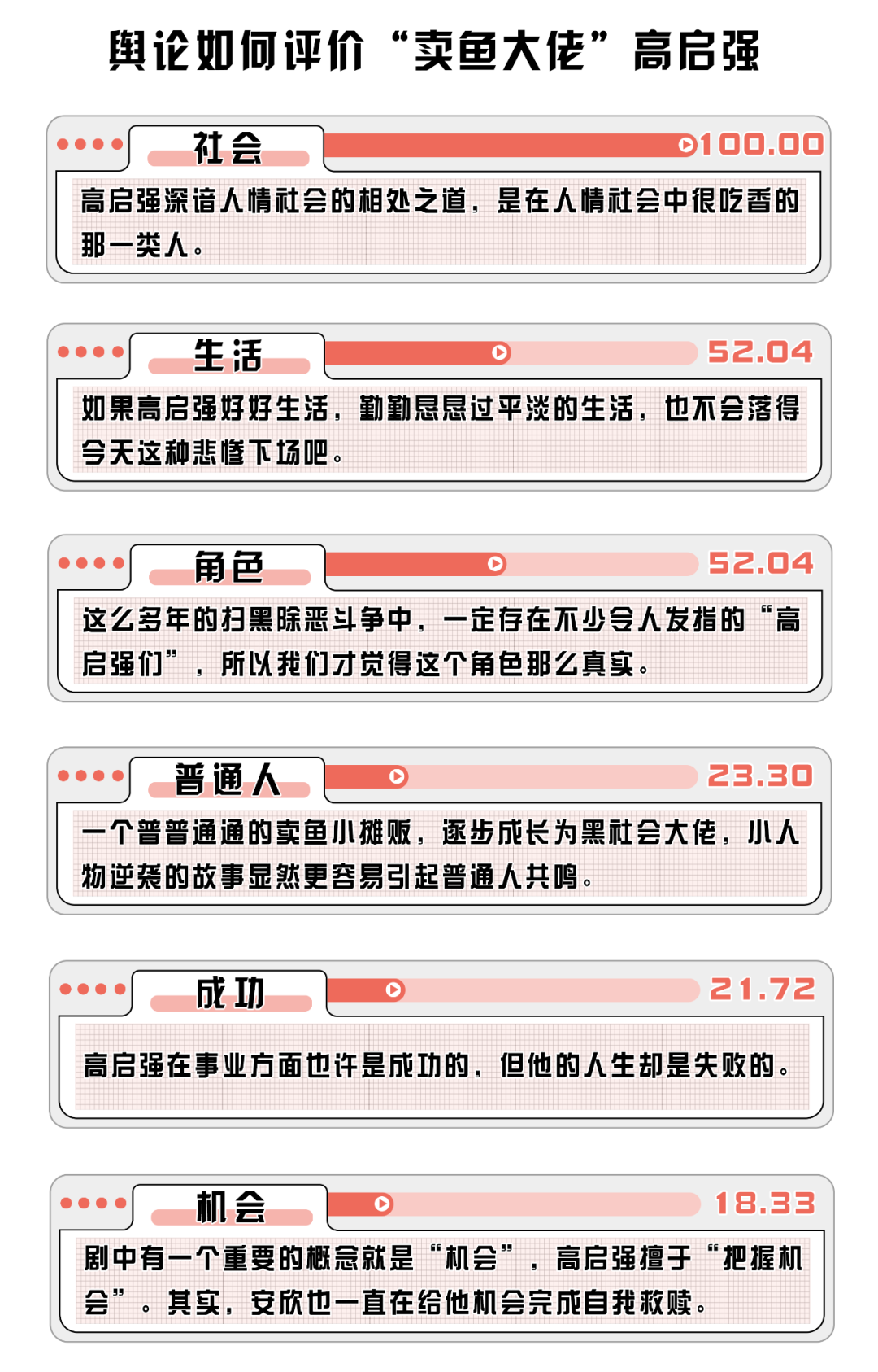 (制作:法治網(wǎng)輿情中心 數(shù)據(jù)來源:收集知乎問題“如何評價《狂飆》中張頌文飾演的高啟強(qiáng)?”下的384個回答,對選取的回答進(jìn)行數(shù)據(jù)清洗及自然語言處理,將熱度最高的詞語規(guī)定為100,并舉例子)