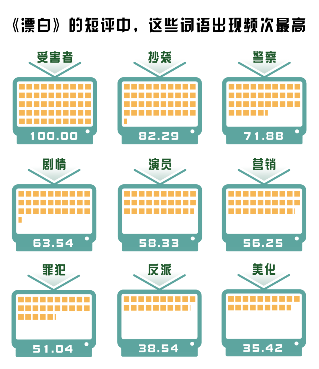 (制作:法治網(wǎng)輿情中心 數(shù)據(jù)來源:選取400條《漂白》豆瓣短評,對短評做分詞及歸一化處理,進(jìn)行分詞后將熱度最高的詞語規(guī)定為100)