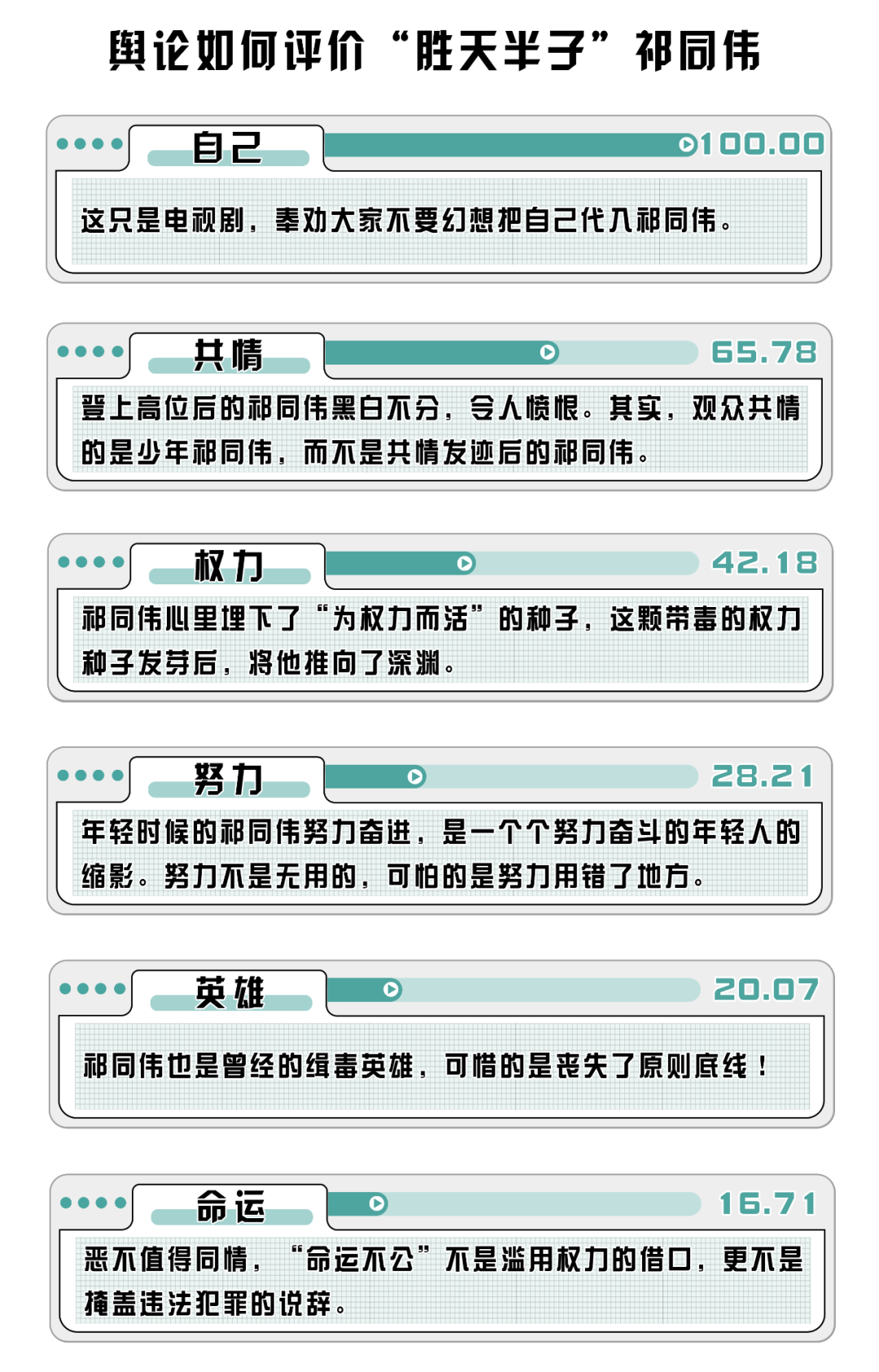 (制作:法治網(wǎng)輿情中心 數(shù)據(jù)來源:收集知乎問題“為什么有那么多人會共情《人民的名義》中的祁同偉”下的920個回答,對選取的回答進(jìn)行數(shù)據(jù)清洗及自然語言處理,將熱度最高的詞語規(guī)定為100,并舉例子)