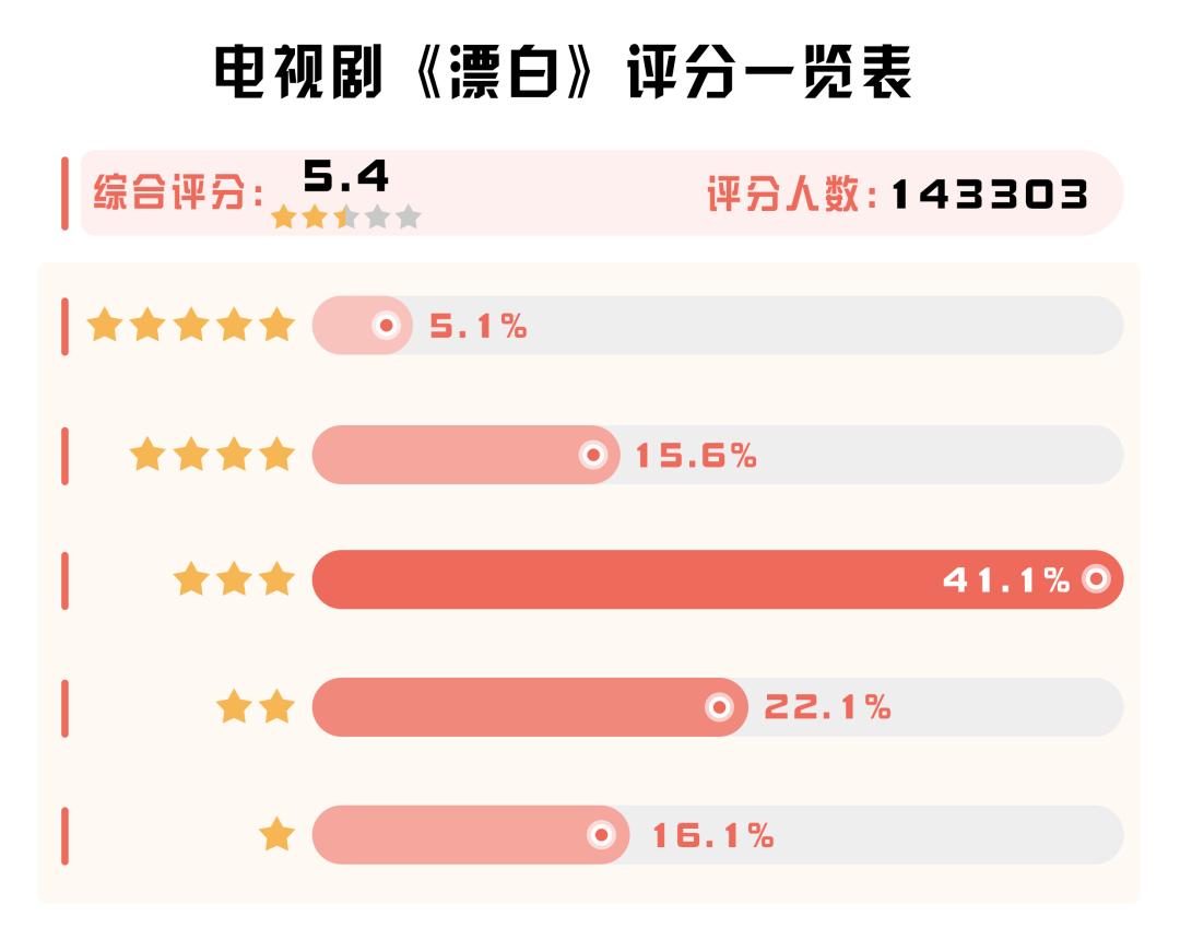 作為開年熱播劇,《漂白》的豆瓣評分從最初的6分降為5.4分。在參與評分的14萬余名觀眾中,41.1%的觀眾給出了三星,僅5.1%的觀眾給出了五星好評。跌破“及格線”的成績似乎并不理想,其中一個重要原因是該劇被指“過度美化反派”。